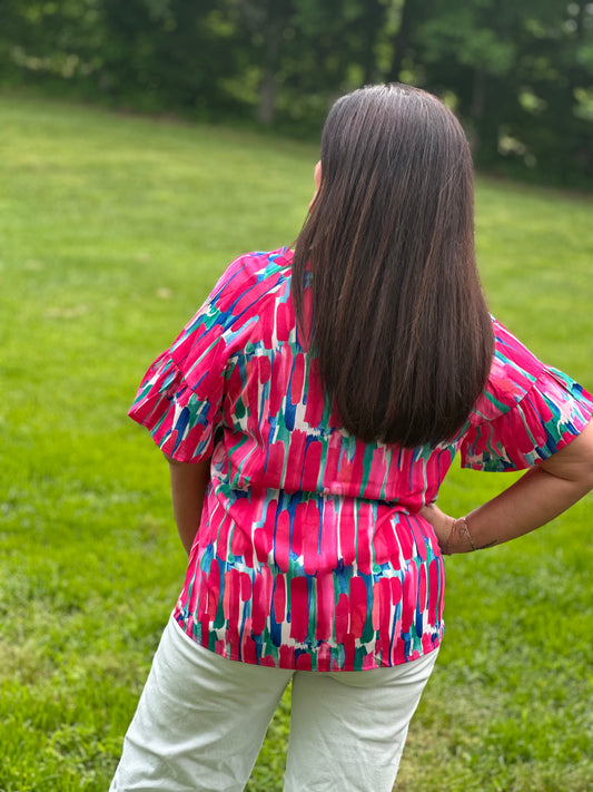 Pink Button Top with Ruffle Sleeve