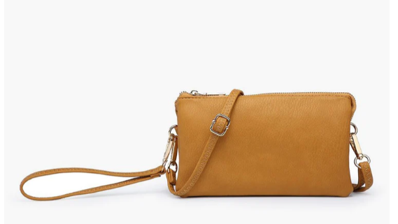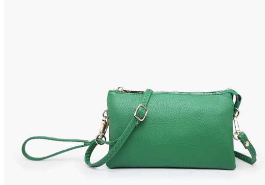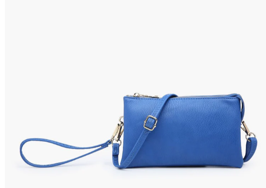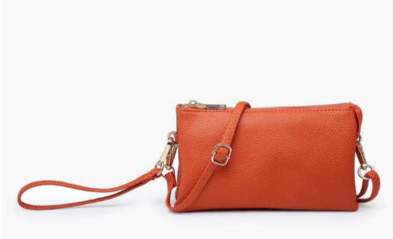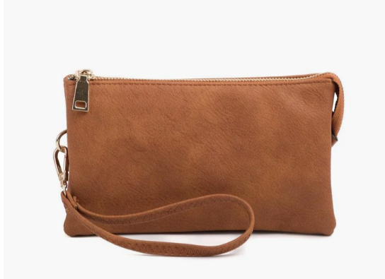 This crossbody/clutch has two major compartments with one middle zipper pocket and a top zipper closure. Inside are two slip pockets and six cardholders. Wear it as a crossbody or use it as a clutch! Includes a detachable wristlet strap and an adjustable shoulder strap.