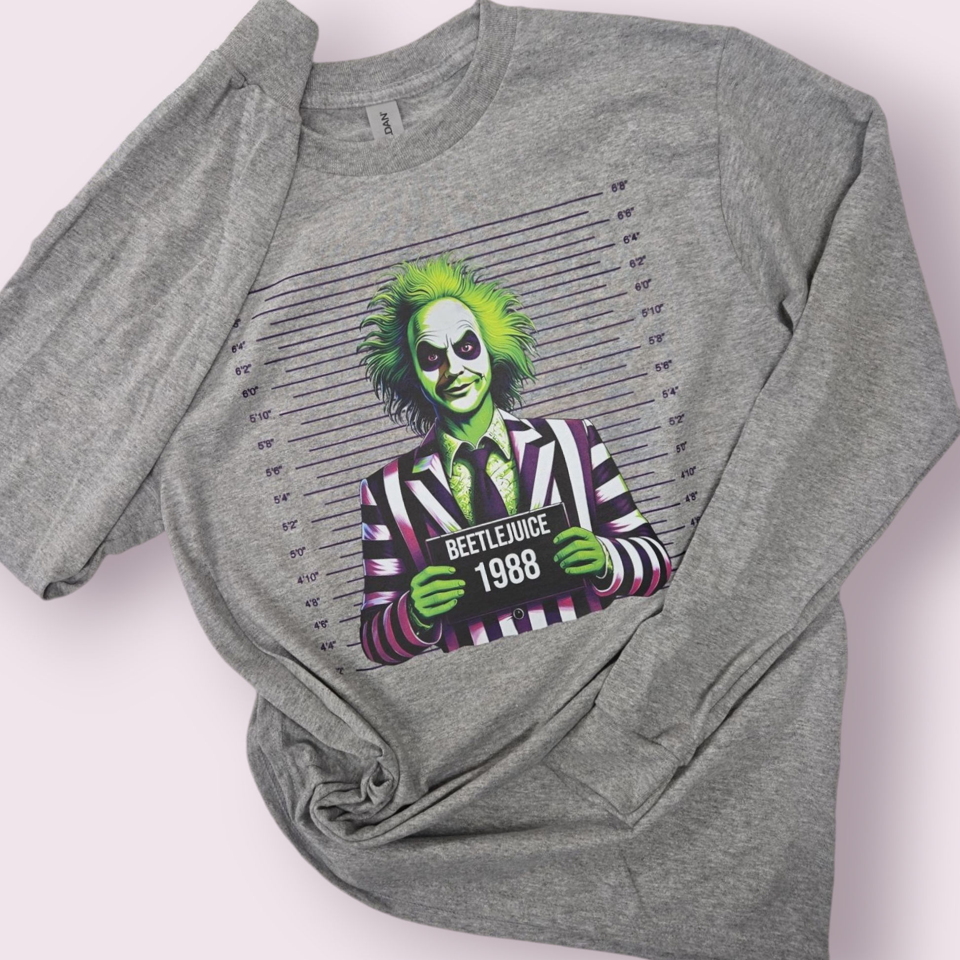 Unleash your inner mischief with the Beetlejuice Mug Shot Tee. Featuring the iconic Beetlejuice and long sleeves perfect for Halloween, this tee is a must-have for any fan. Add a touch of mischievous fun to your wardrobe and make a statement that'll turn heads (in a good way!).