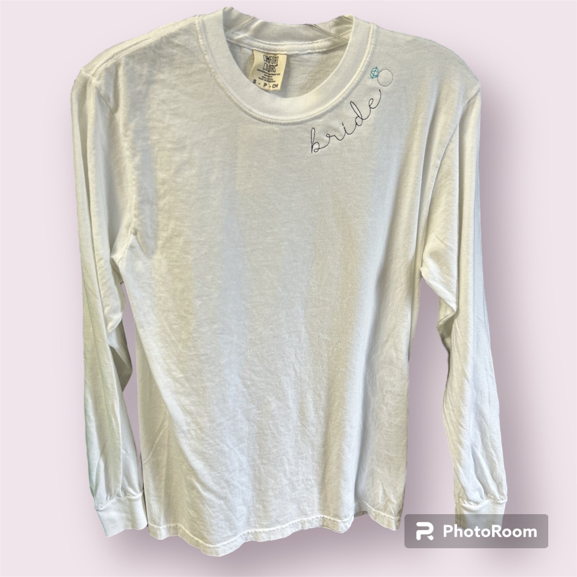 Get ready to say 'I do' in style with our Bride Long Sleeve Tee. This playful top features delicate neckline embroidery and a cute ring graphic, perfect for any bride-to-be. Give yourself the bridal treatment and rock this tee on your big day (or any day, really!). #bridegoals