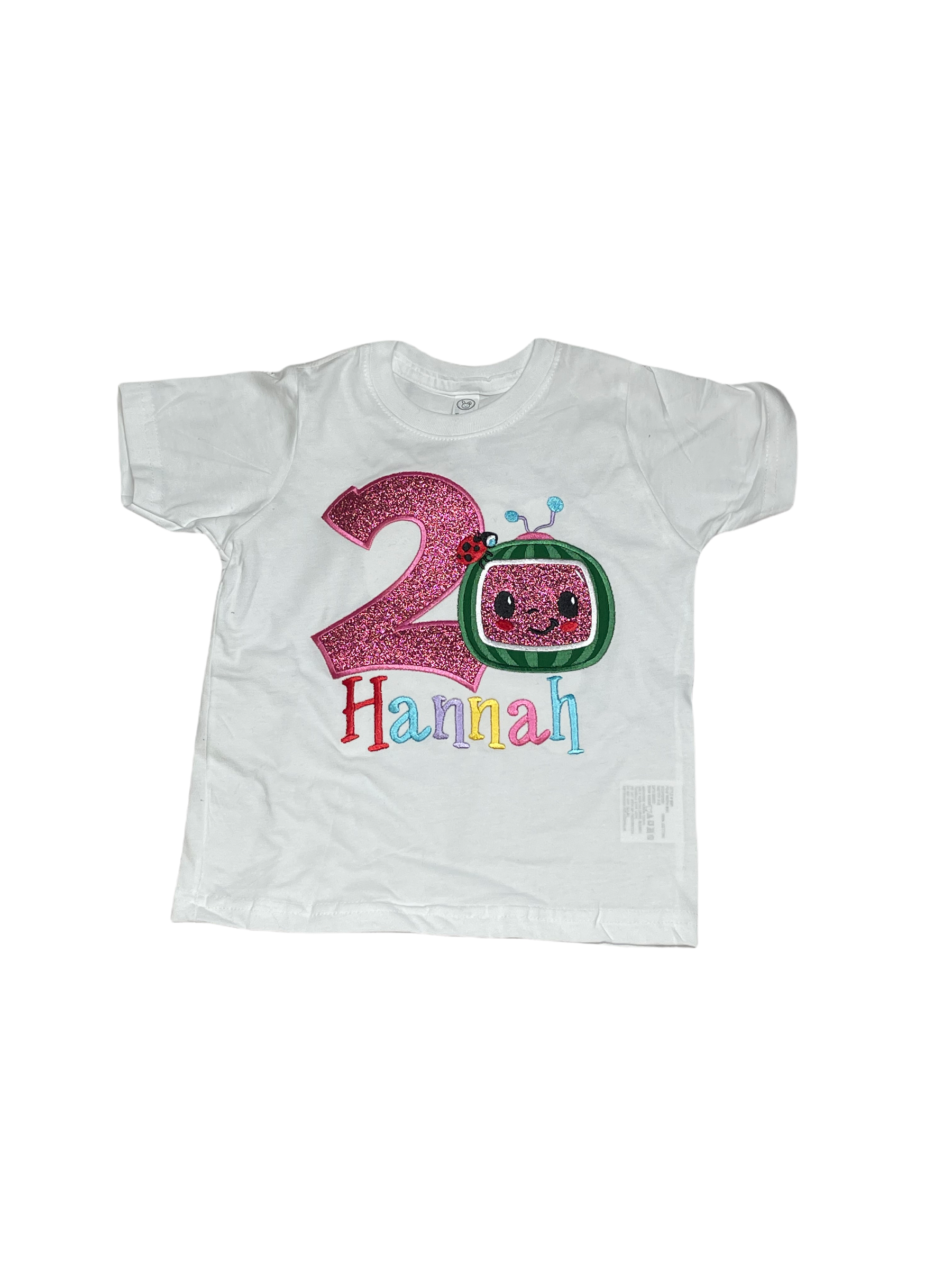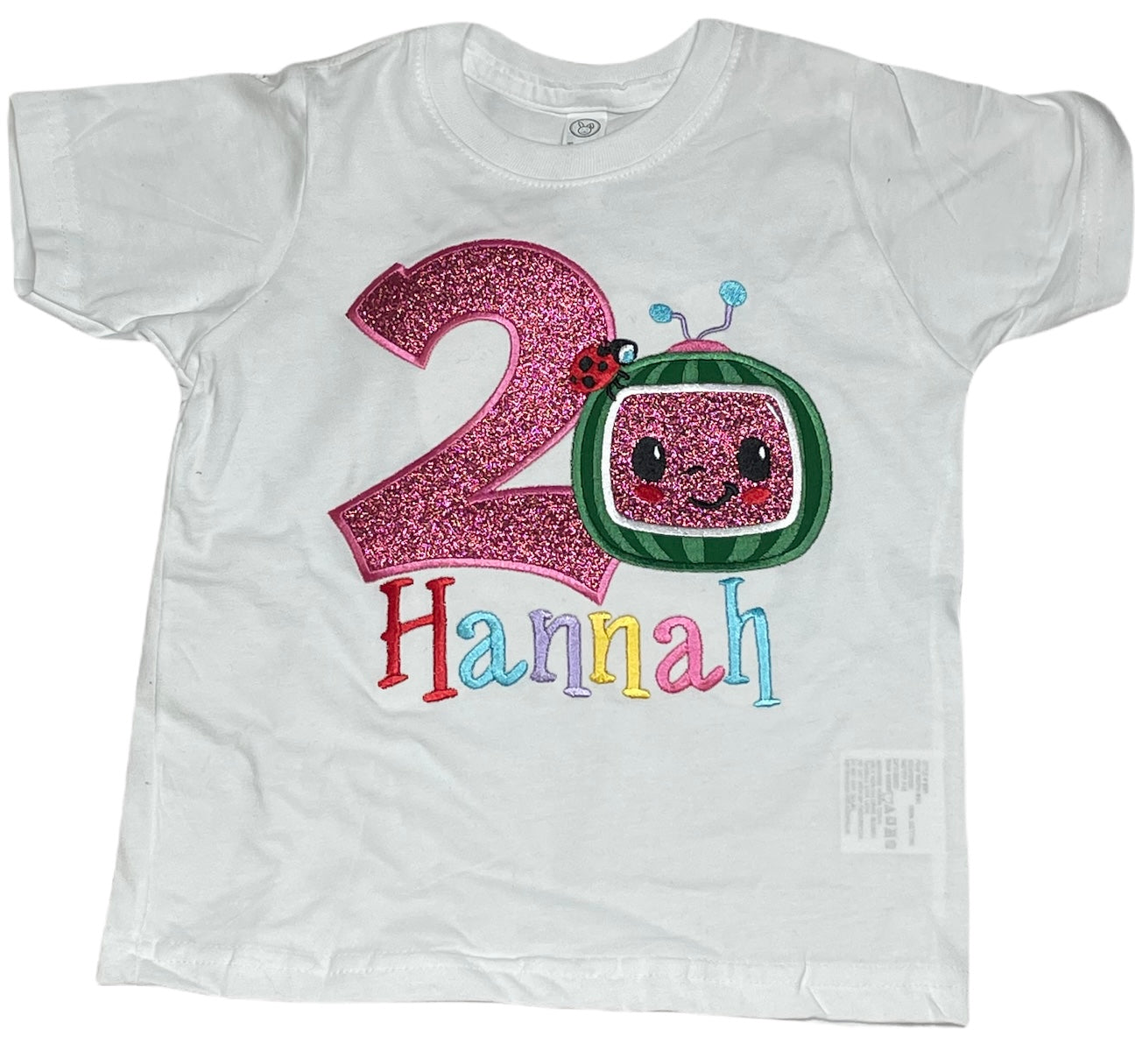 Coco Melon Inspired Tee perfect with the glitter and multi colors for a girl's tee, need for a boy just let us know and we can make t in boy colors!