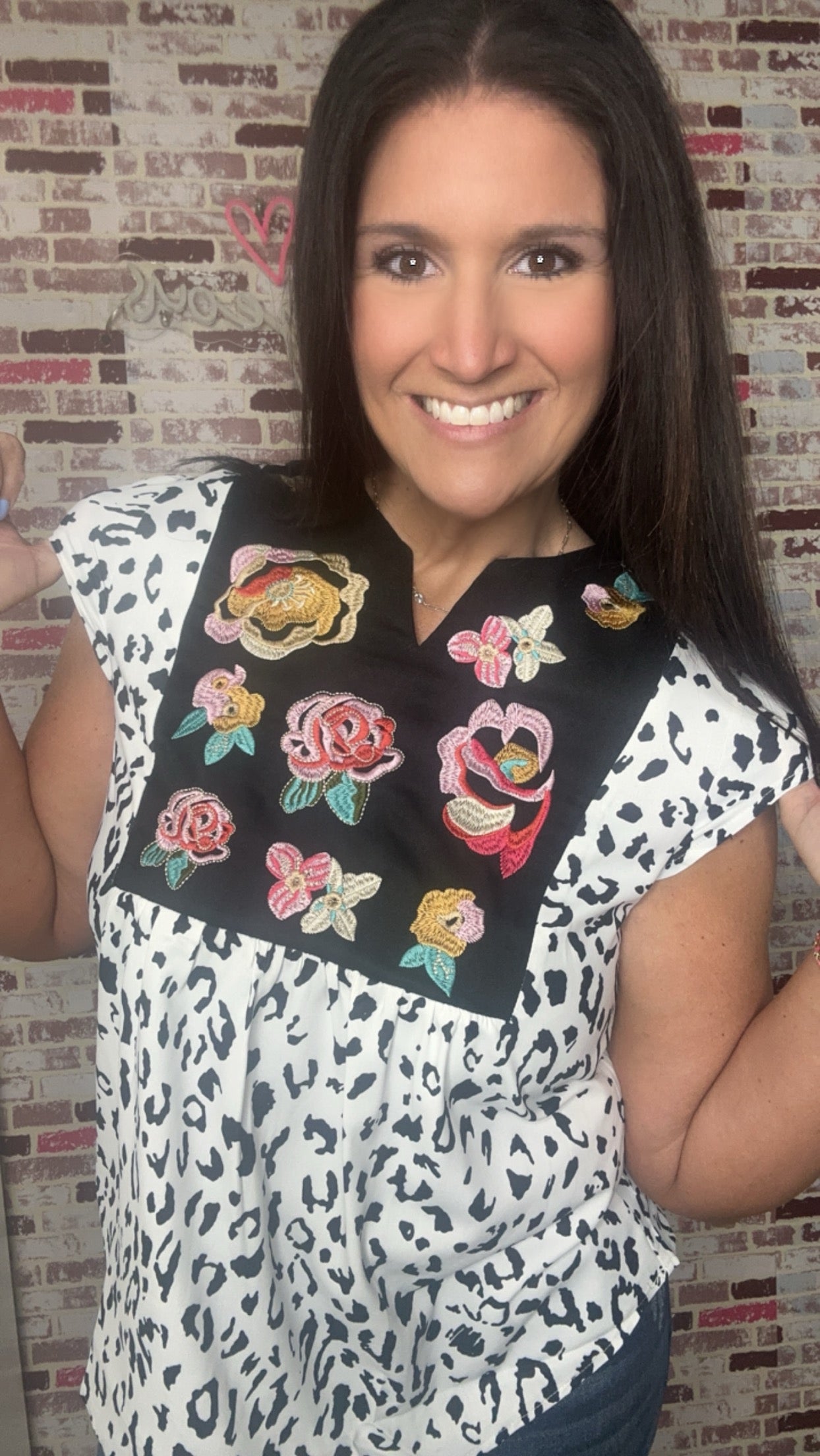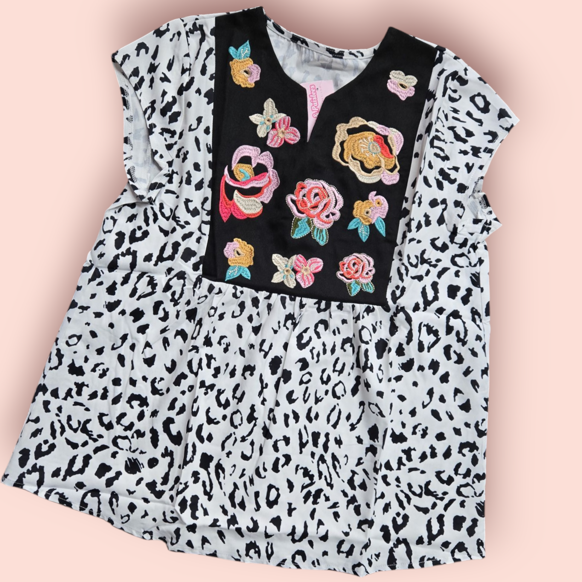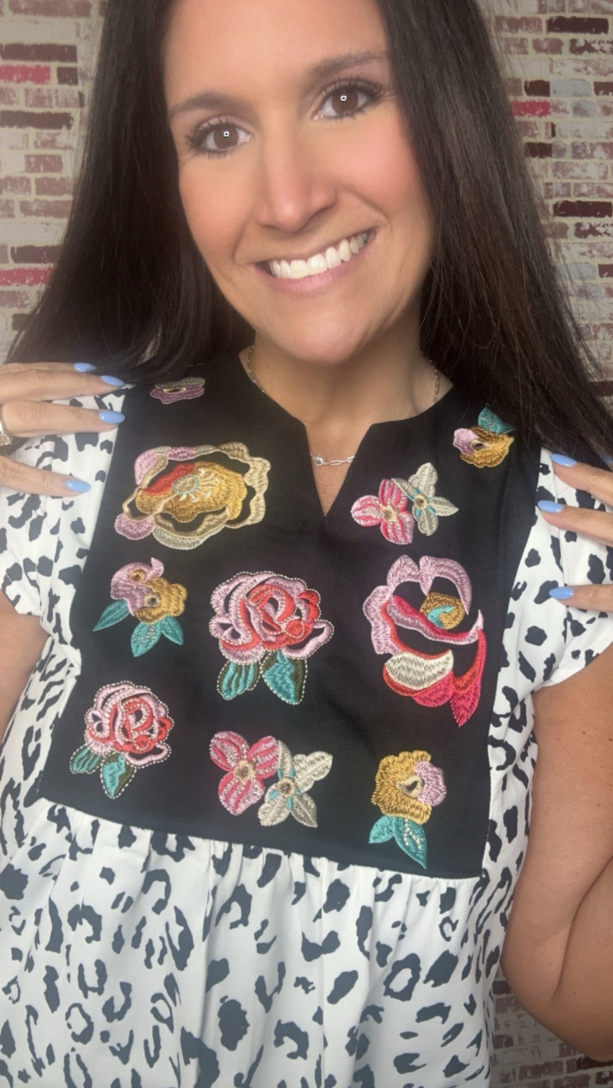 Add a touch of playful print to your spring wardrobe with our Hold My Hand Top. Featuring a whimsical dalmatian pattern and delicate floral embroidery, this blouse is perfect for any springtime adventure. Grab one now, before they're gone!