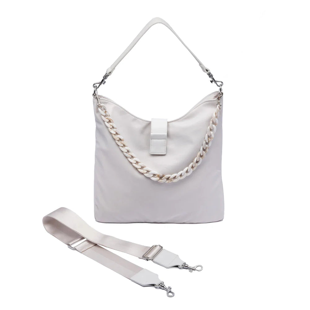 - Can be worn three different ways—it’s three bags-in-one- perfect for travel! Wear it: 1) Crossbody (with or without adornment chain) for a casual look 2) Over the shoulder with short strap and adornment chain for a dressed up look 3) Over the shoulder using chain as strap to mix it up