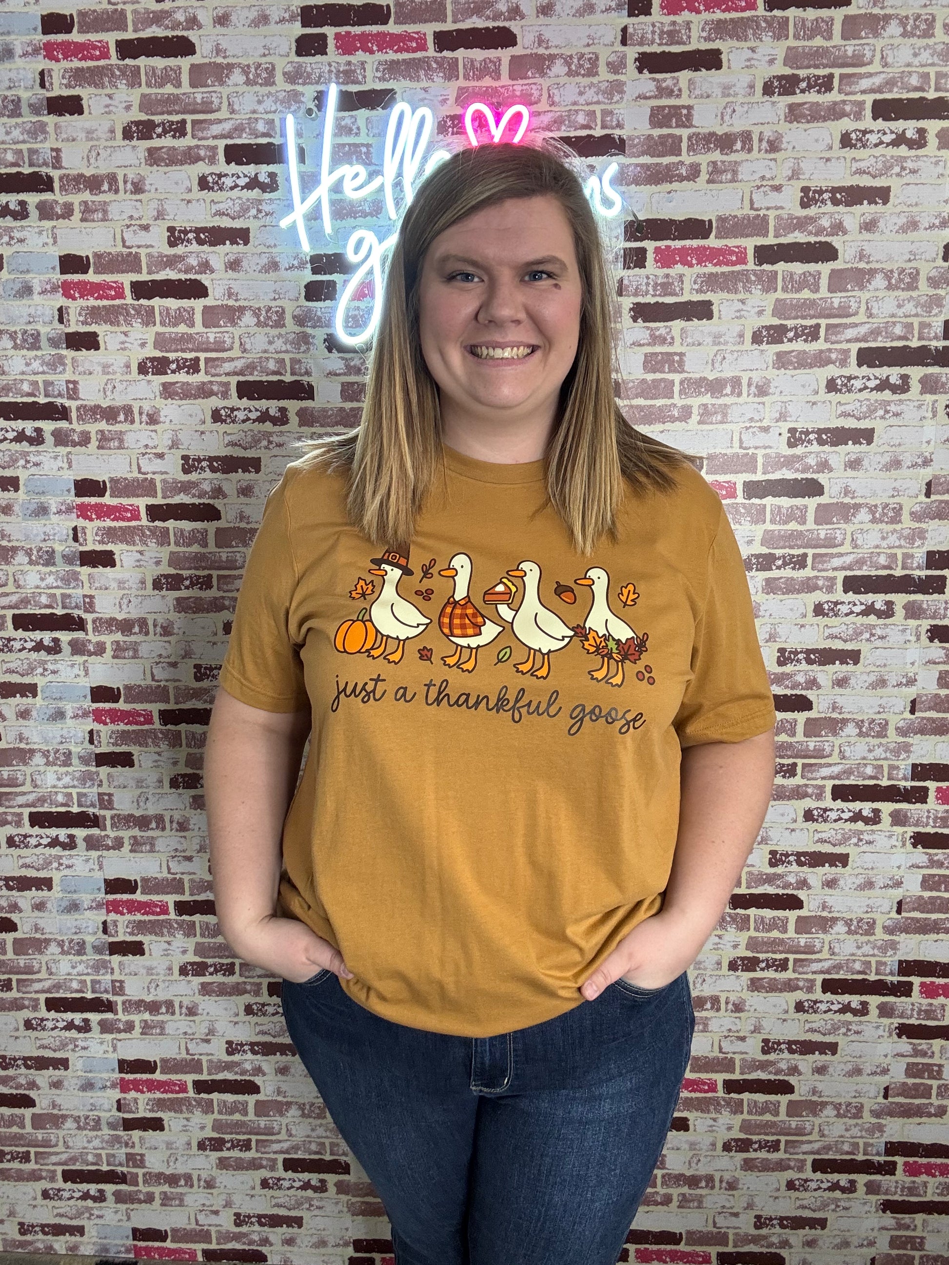 Celebrate Thanksgiving with the Just a Thankful Goose Tee, perfect for adding a playful touch to your holiday wardrobe. Featuring a charming goose design that shows off gratitude in a fun way, this tee is comfy for all-day wear—whether you're passing the cranberry sauce or relaxing after dinner. Spread smiles and thanks in style this season!