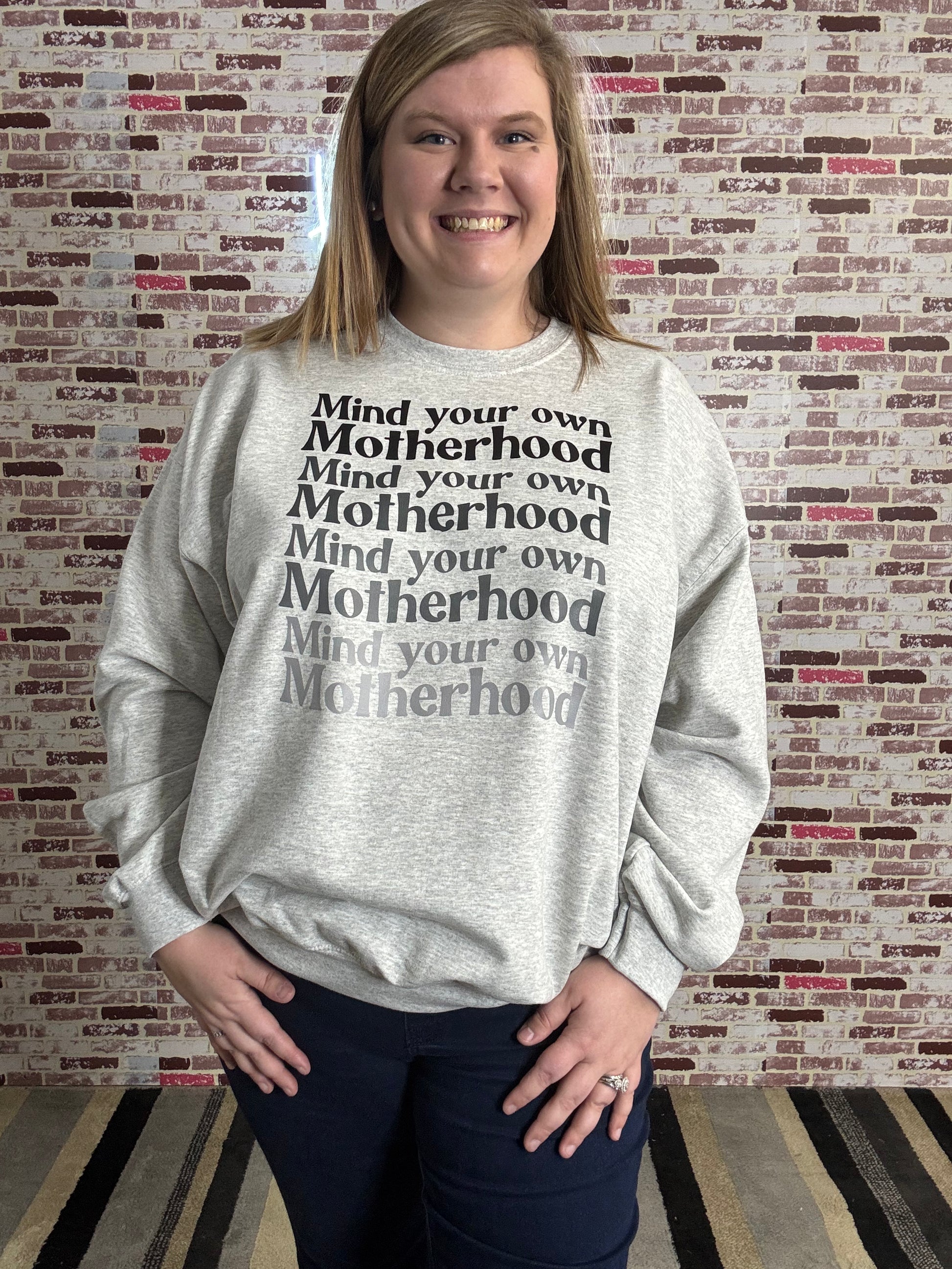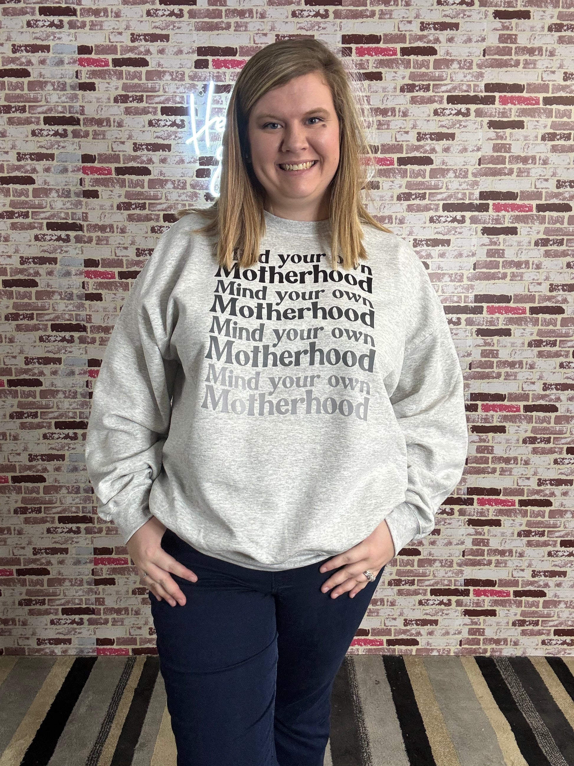 Stay cozy and confident in this ash gray sweatshirt featuring the cheeky phrase "Mind your motherhood." Perfect for moms who embrace their unique journey with a playful attitude, this sweatshirt combines comfort with a fun reminder to keep the focus where it belongs—on your own amazing motherhood adventure.