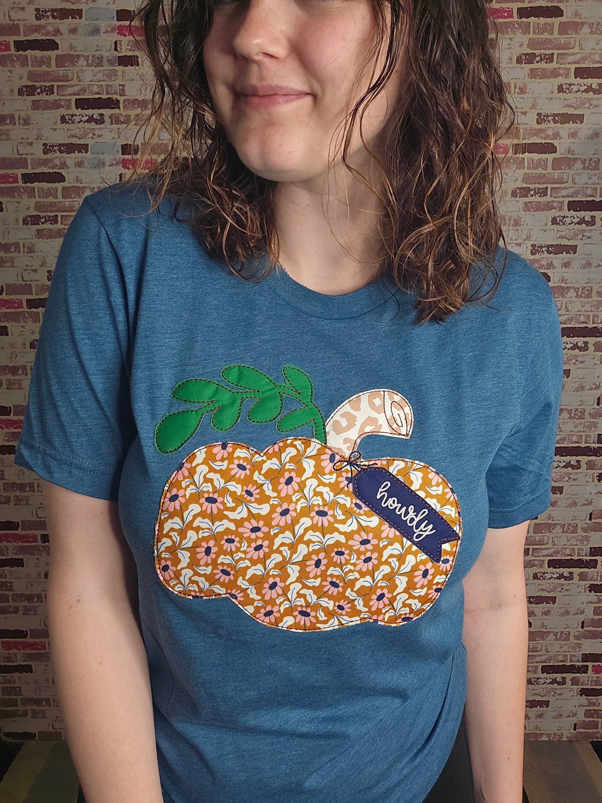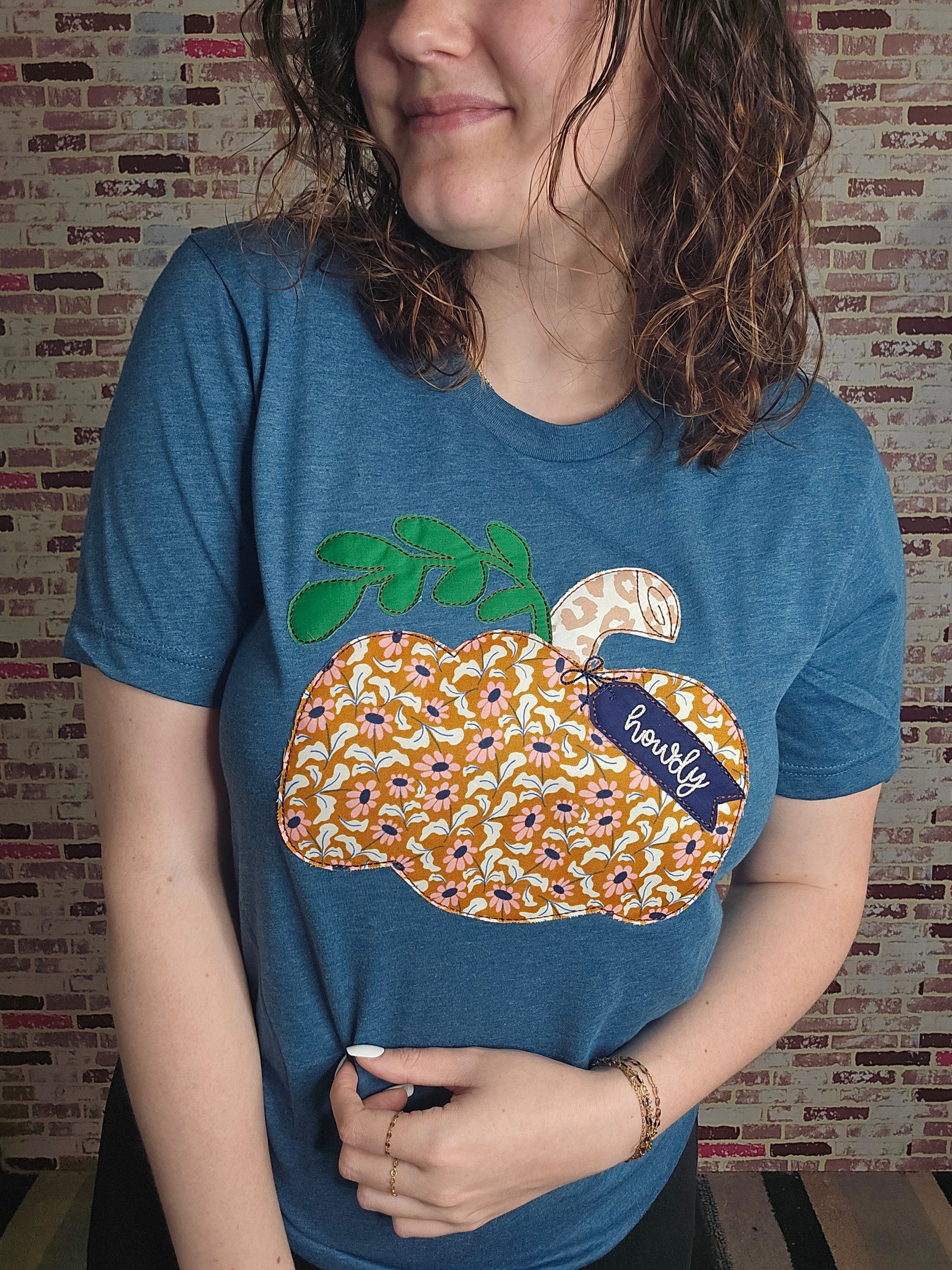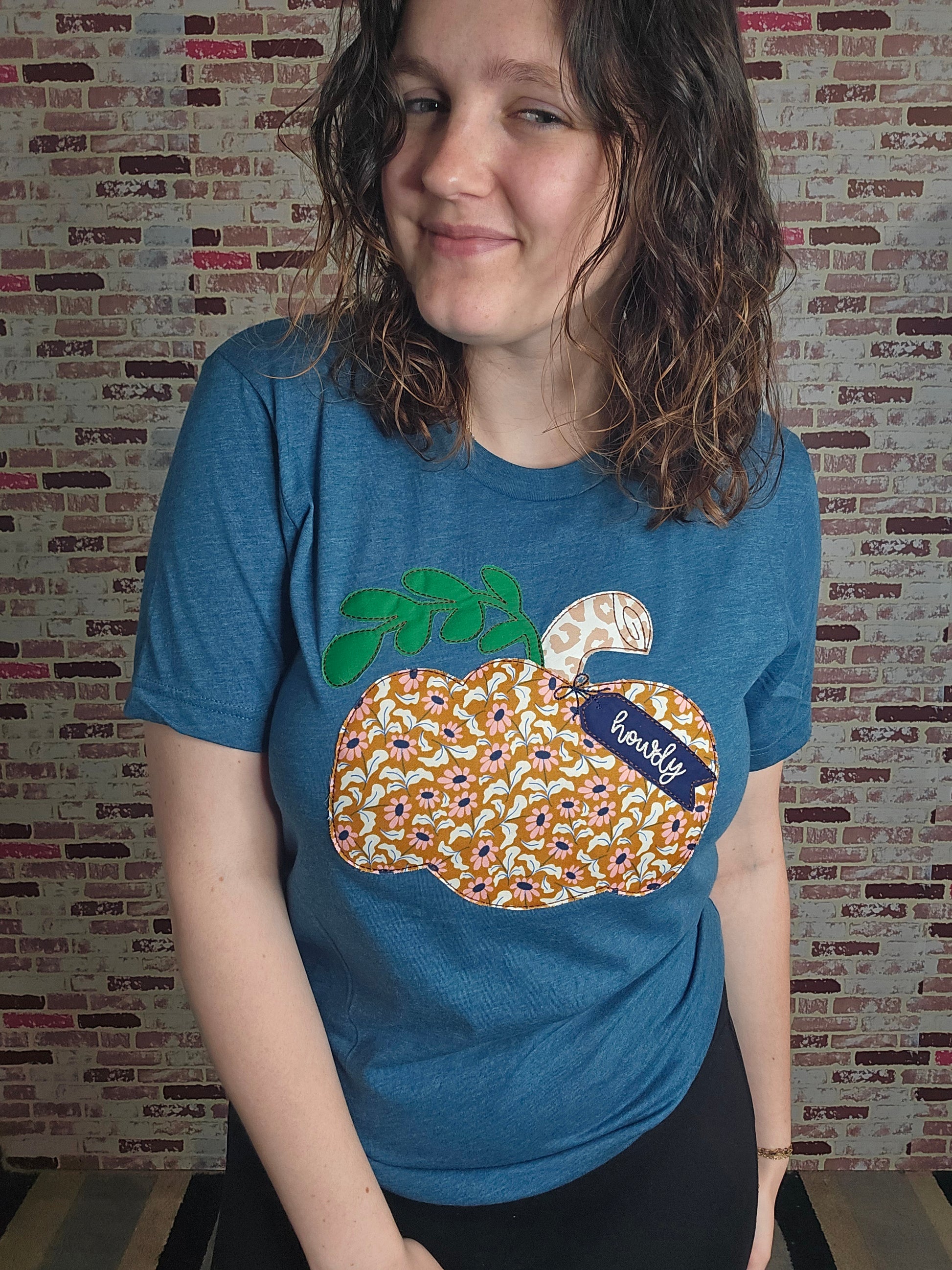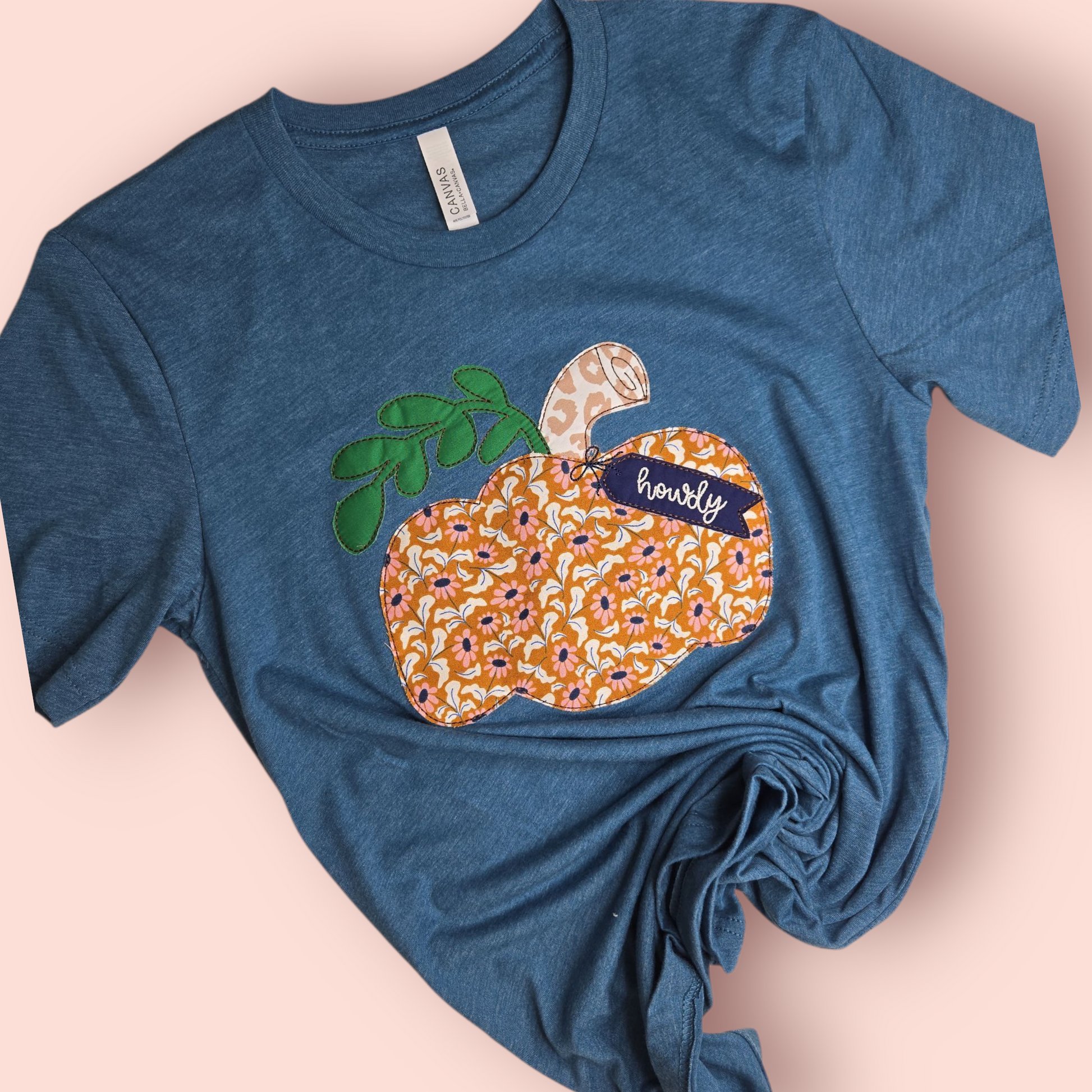 Celebrate fall with this playful teal t-shirt featuring a charming floral pumpkin design and a friendly "howdy" greeting. Perfect for cozy autumn days, it adds a fun and festive touch to your seasonal wardrobe.