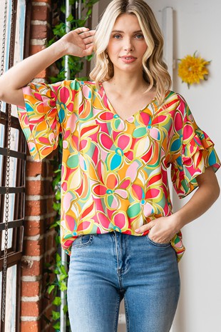 Introducing our Someone New Top! This playful top features a beautiful floral print, half sleeves, and a flirty ruffle V neck. Add a touch of whimsy to your wardrobe and stand out from the crowd. (It's time to bloom in style!)
