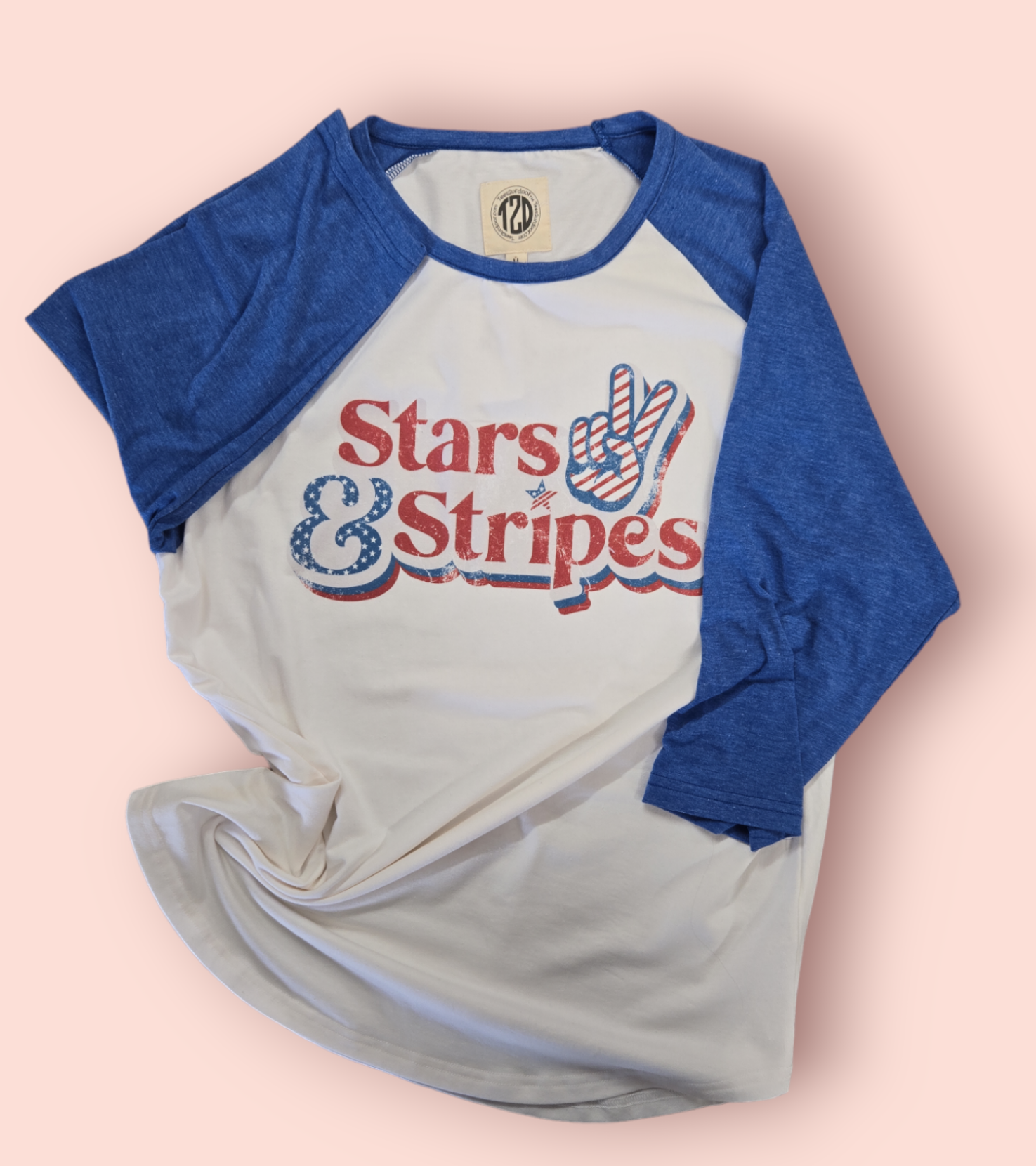 "Score a home run in style with our Stars and Stripes Raglan! Perfect for Fourth of July festivities and a day at the ballpark. Root for your team and country in this patriotic baseball tee! Game on! ⚾️🇺🇸"