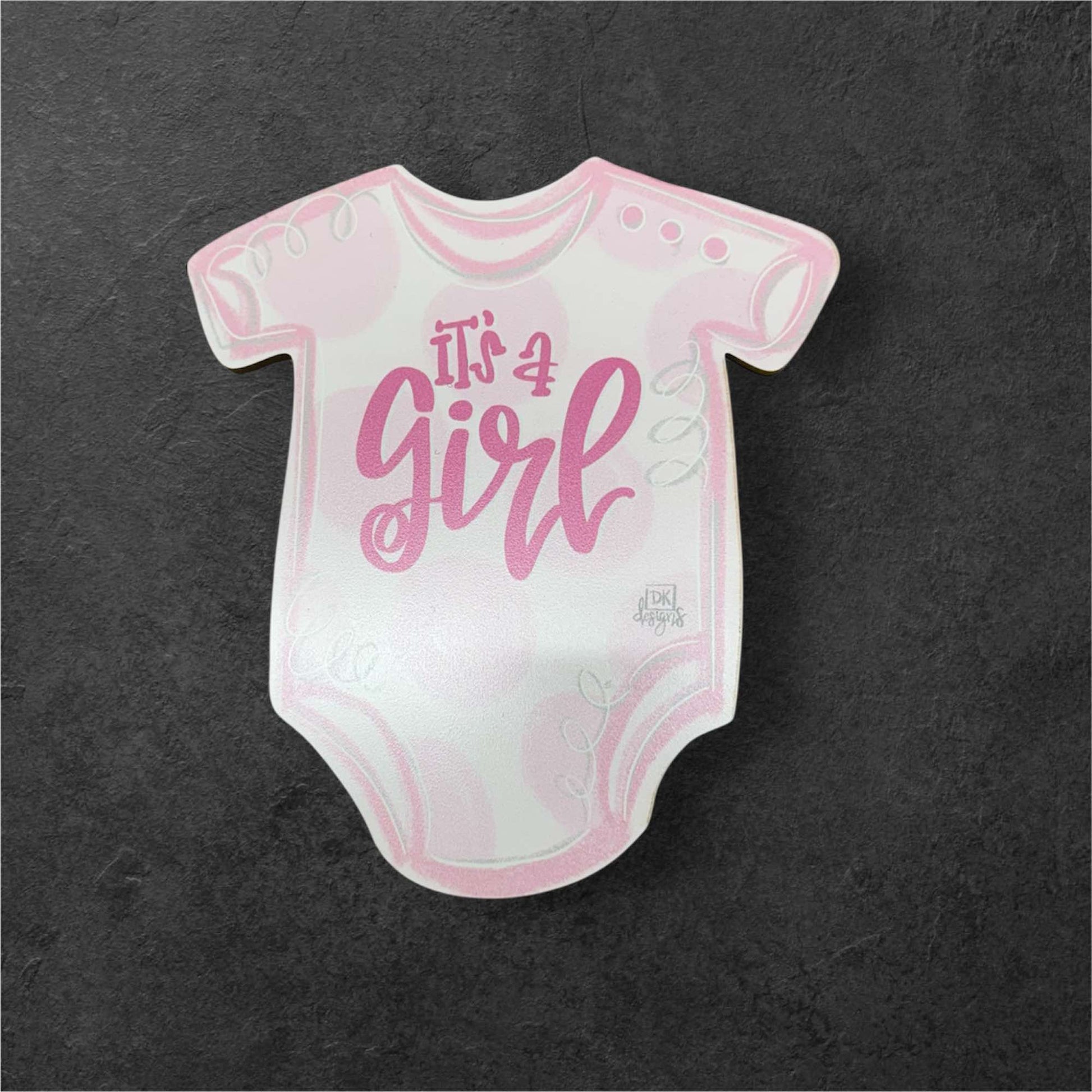 This pink onesie is the perfect way to announce the arrival of a baby girl. Its interchangeable attachment makes it versatile for use on a door hanger, giving it a personalized touch. Made with quality materials, it's a durable and adorable addition to any new parents' collection.
