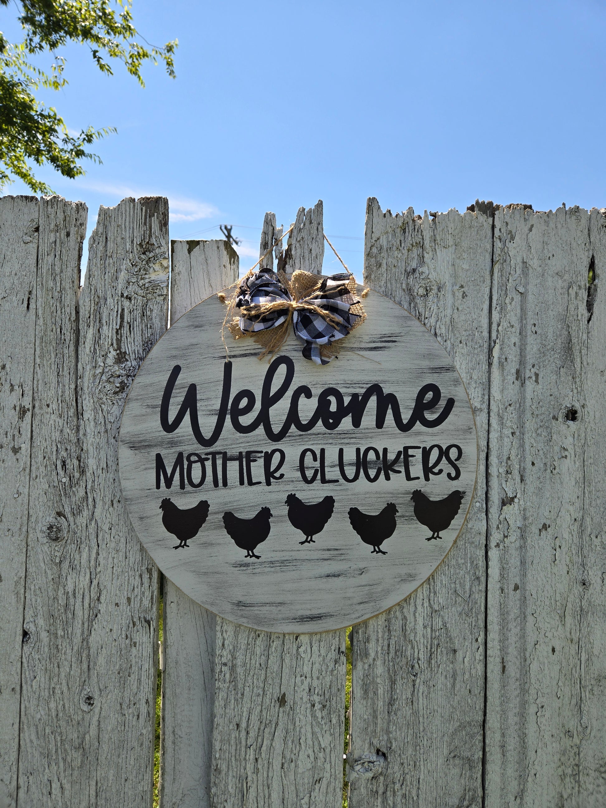 Welcome all feathered friends with our Mother Clucker door hanger, in classic black and white. Perfect for adding a playful touch to your front door. (No need to knock, we'll hear you cluckin'!).
