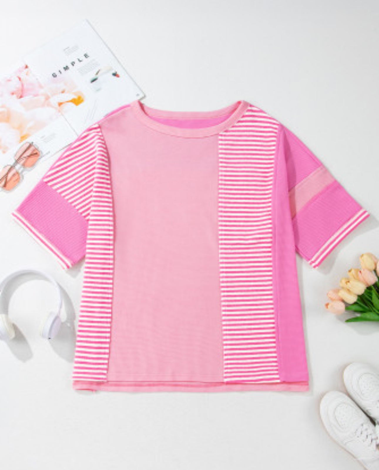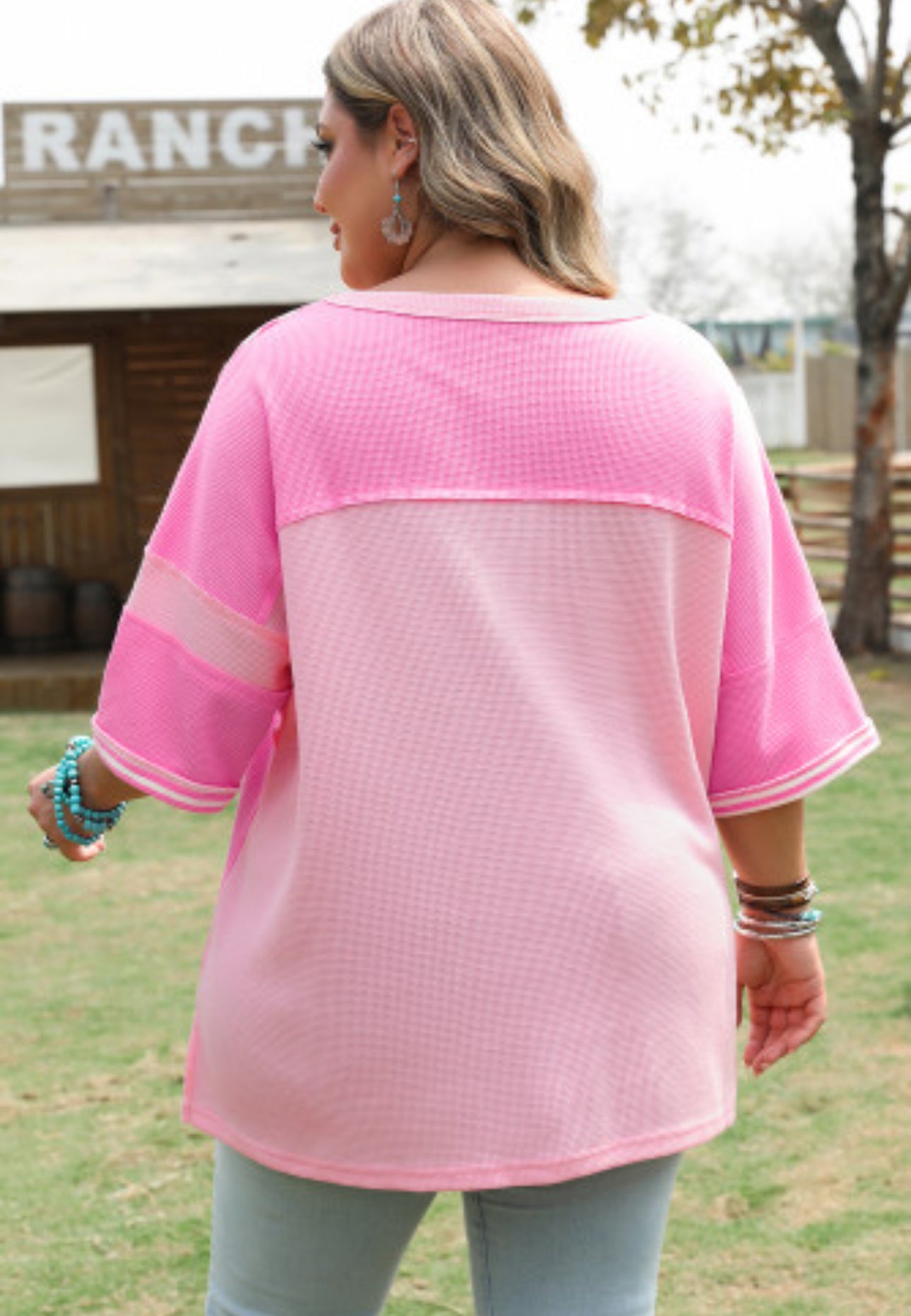 This unique top features a mix of fabrics for a stylish and comfortable fit.